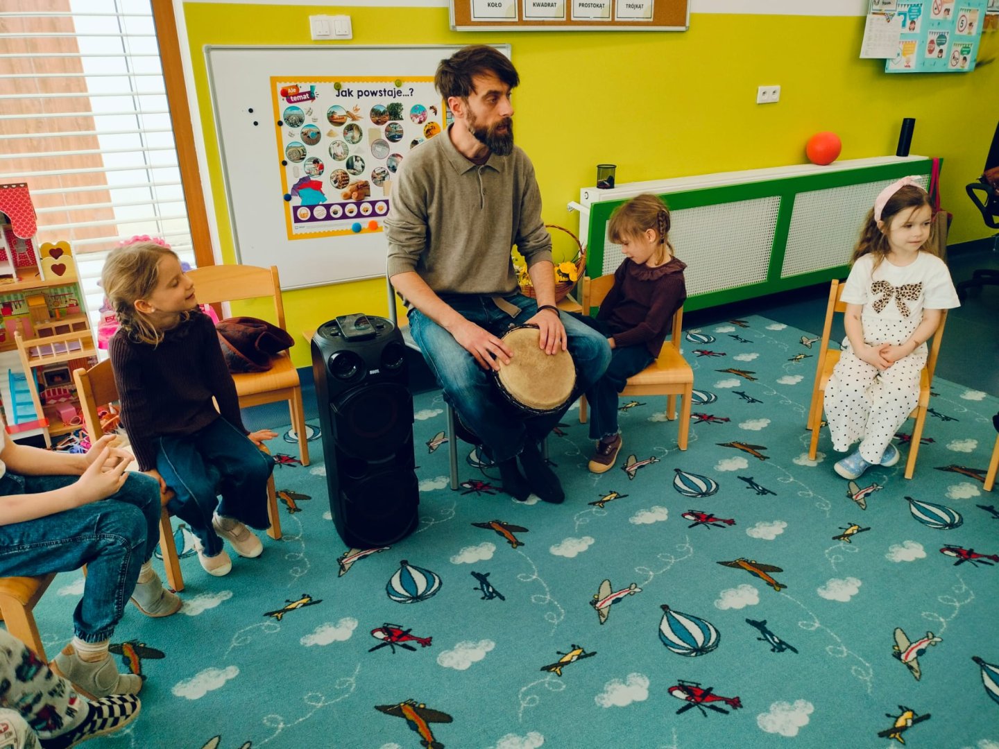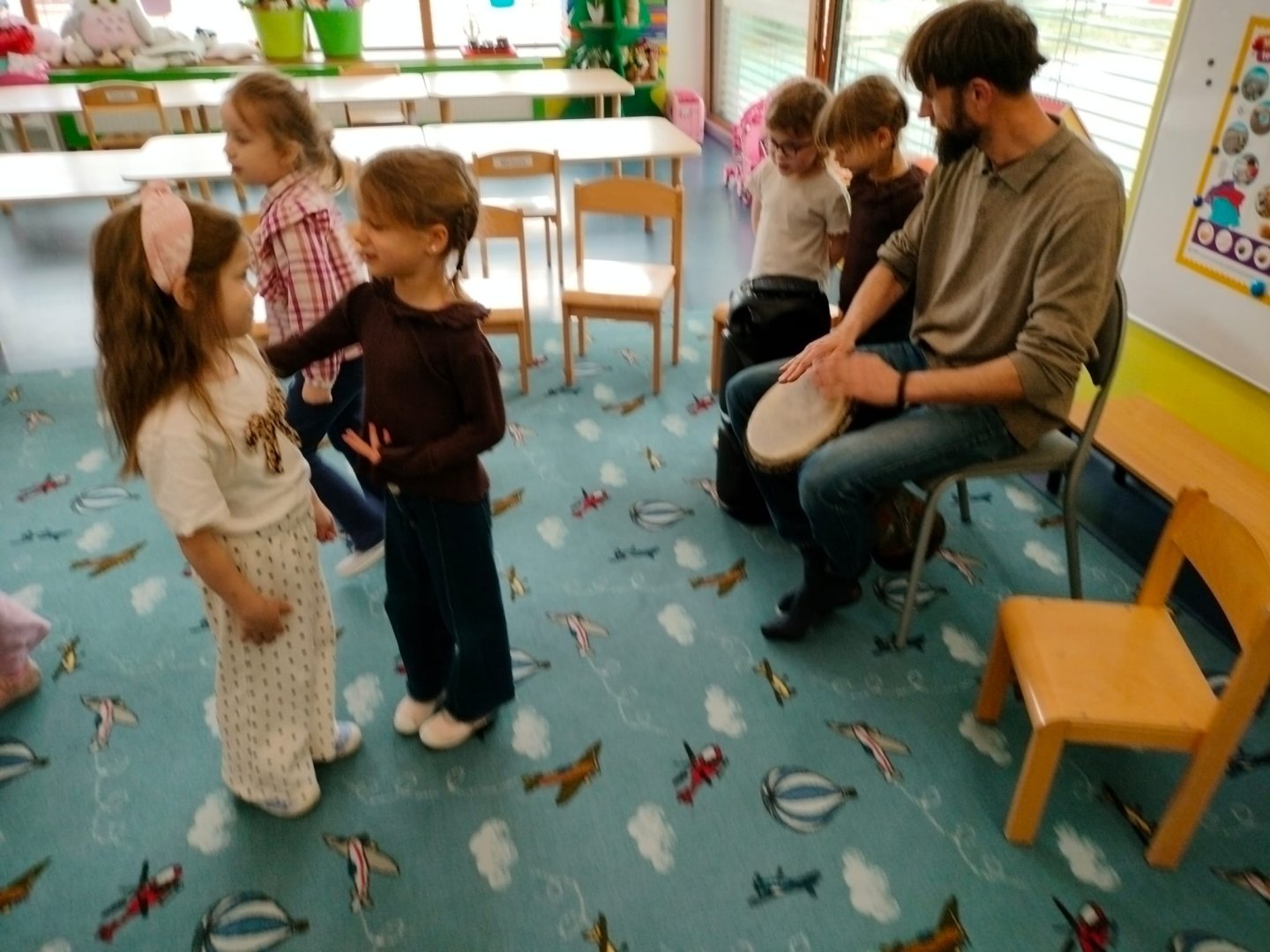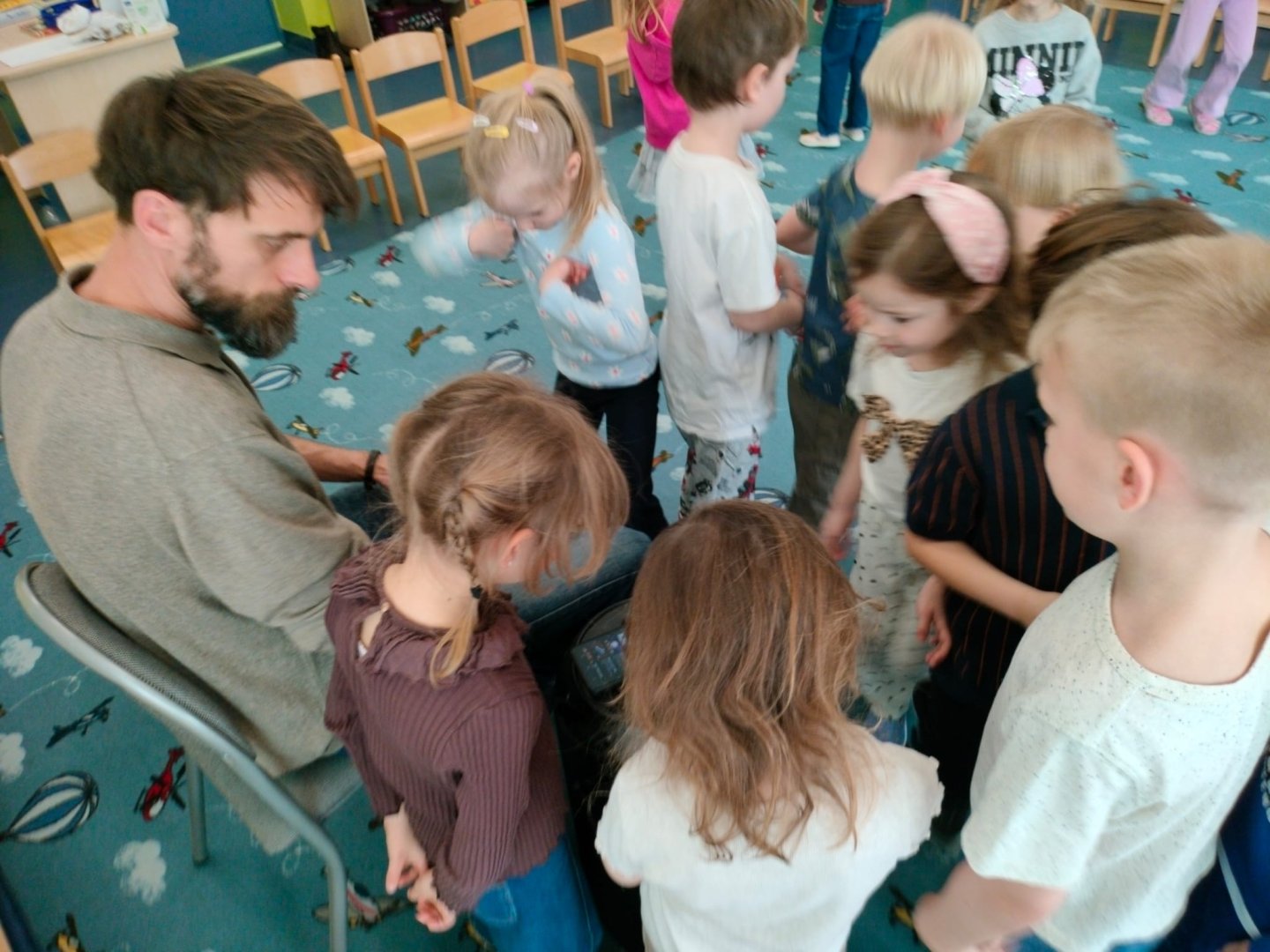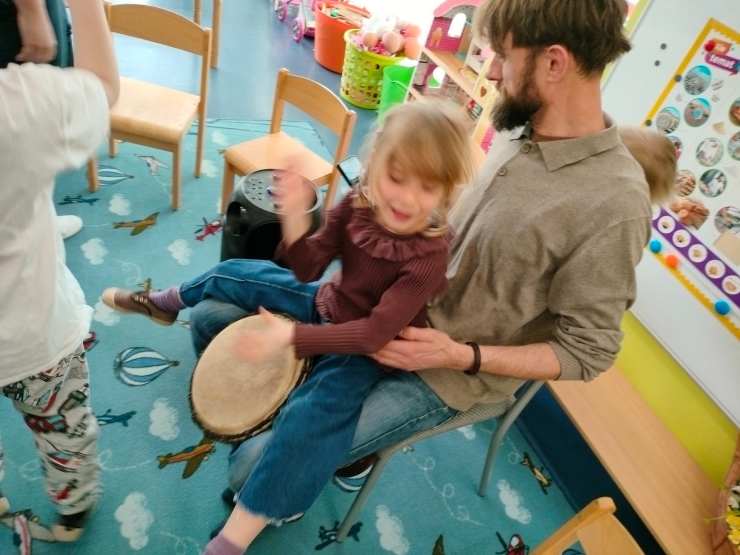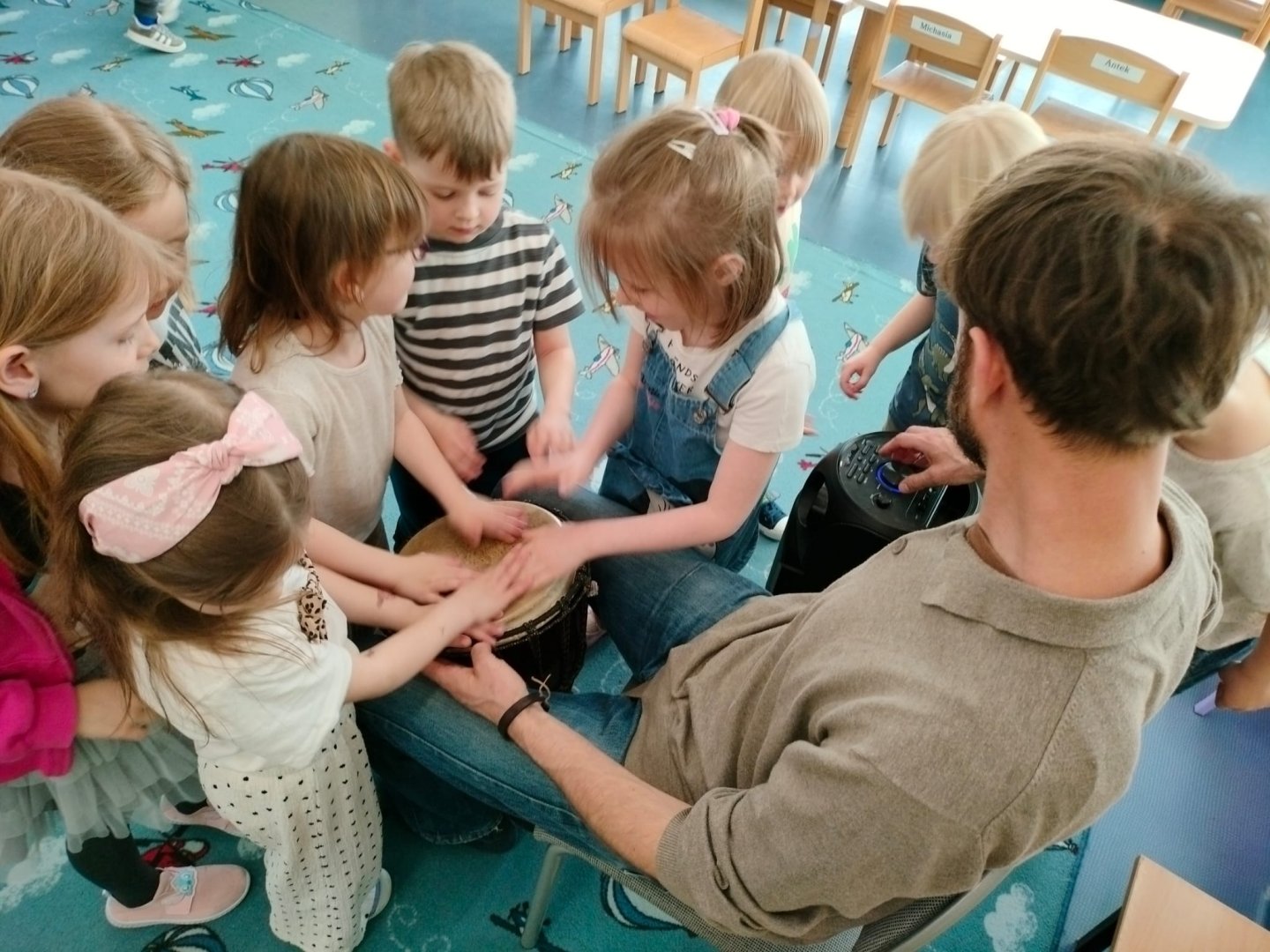 Grupa Niebieska słucha i bawi się przy muzyce granej przez tatę Feli i Romy