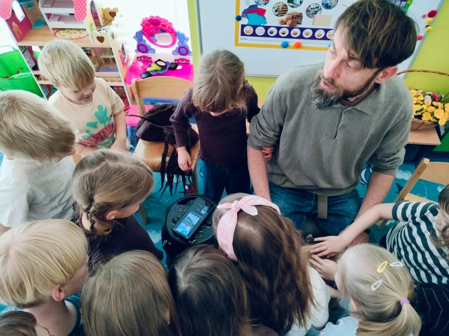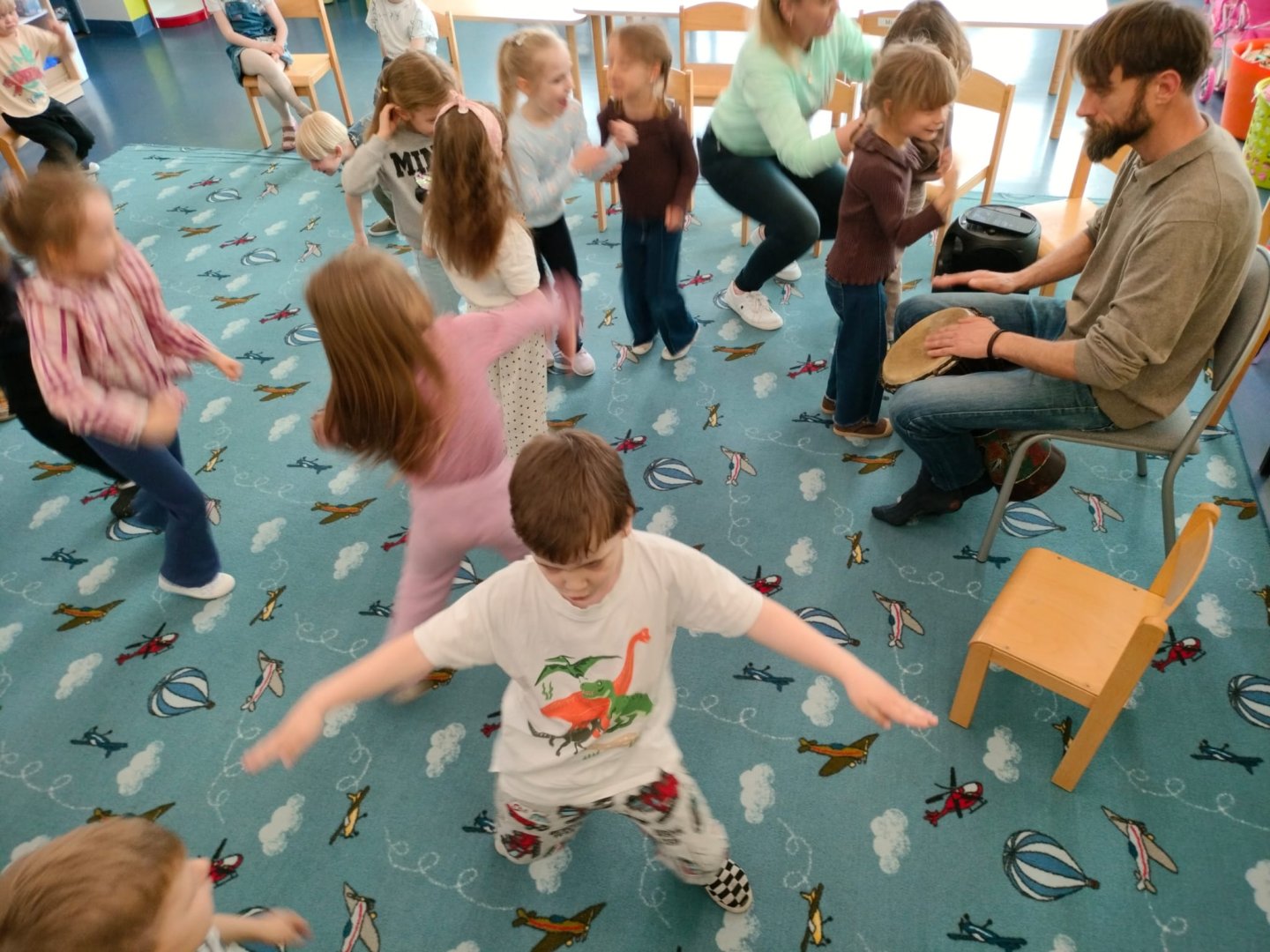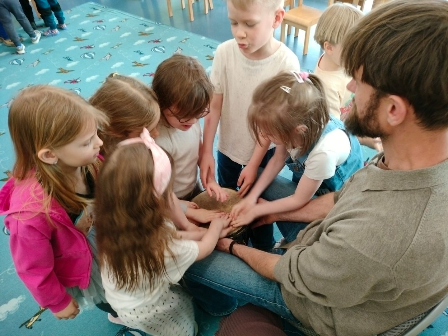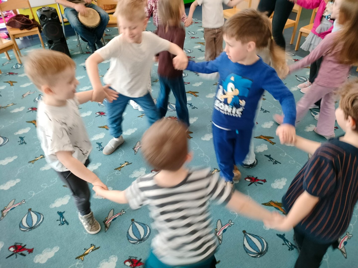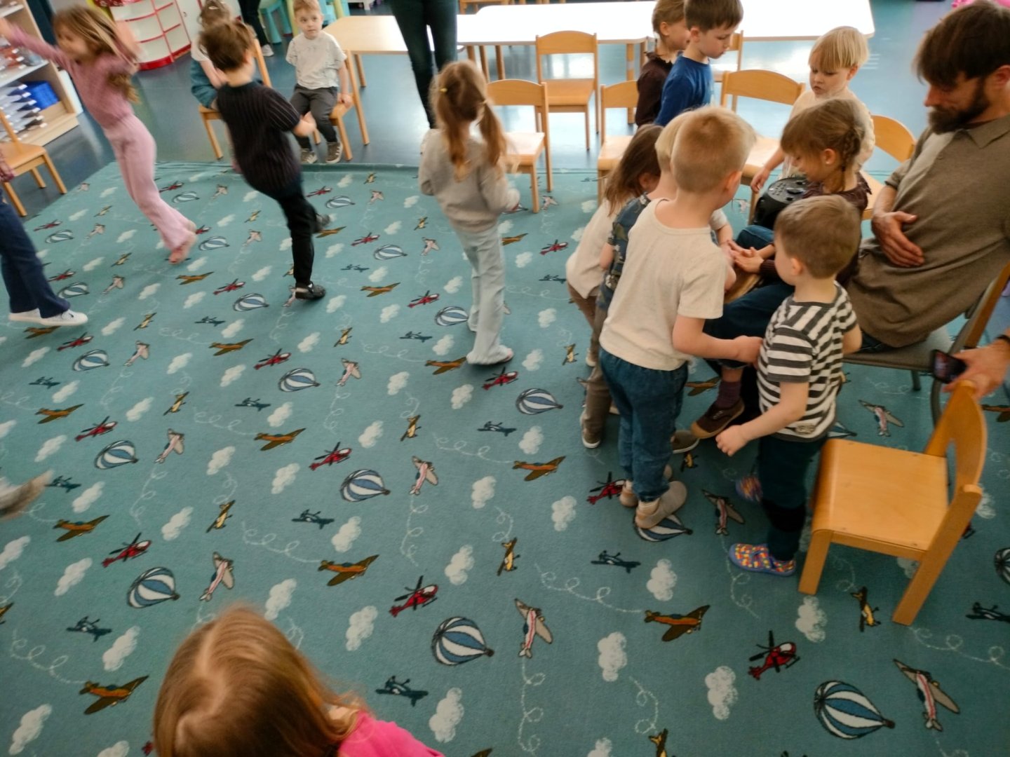 Grupa Niebieska słucha i bawi się przy muzyce granej przez tatę Feli i Romy